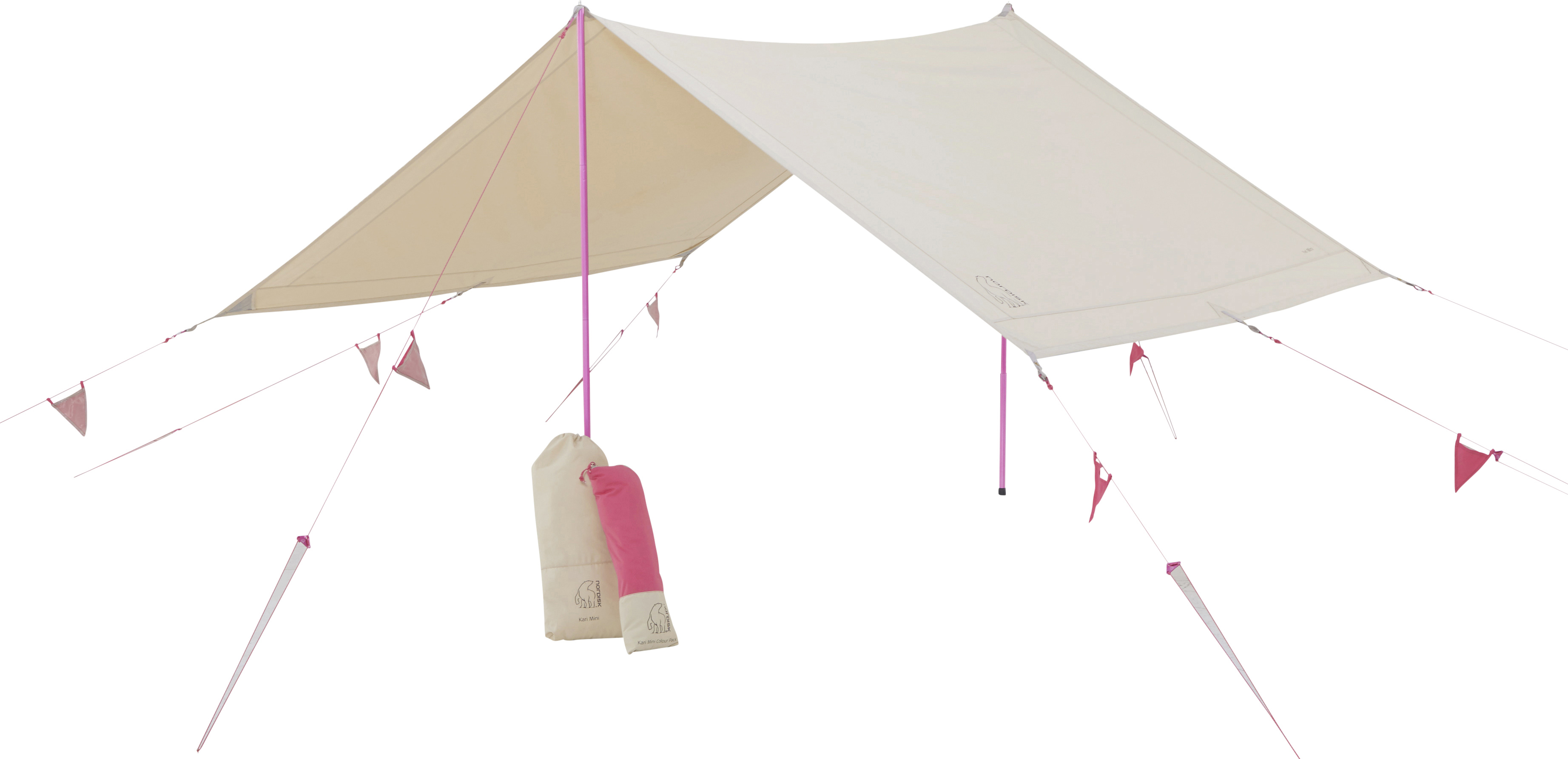 The Kari Tech Mini Colour Packs contain all you need not only to set up your Kari Mini tarp, but also to make it yours. With the Kari Tech Mini tarp and the different colour packs, you will never again miss your camp at a festival. Will it be the cherry pink one? Or do you prefer mustard yellow? Each colour pack holds 2 adjustable tarp poles, all pegs, all guy ropes – all in the same of the “Colour my Adventure” colours. The poles are height-adjustable from 1.6 to 1.9 metres and are made from lightweight aircraft grade aluminium, as are the sturdy skewer pegs. Poles and pegs come with individual bags for separate packing if needed. Each of the guy ropes is equipped with a triangular slider for easy adjustment, a Mini Hook for easy attachment to the tent and a mesh pocket triangle, which doubles as guy rope holder and guy rope warning flag for more safety, when the guy ropes are pegged out.
