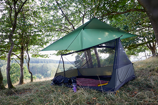 Troms Mesh Cabin is a unique piece of hardware when wanting to sleep under the open sky or under a tarp while being free of bugs. To protect against the elements, the tent has a 40 cm wall at all sides; made from 15D rip-stop nylon. Two persons including gear will fit nicely. It can be set up with two walking poles, branches or between two trees and it requires only 6 pegs and is compatible with all the Nordisk Voss tarps. The tent has two entrances; end and side, designed to fit and connect with any chosen tarp setup.