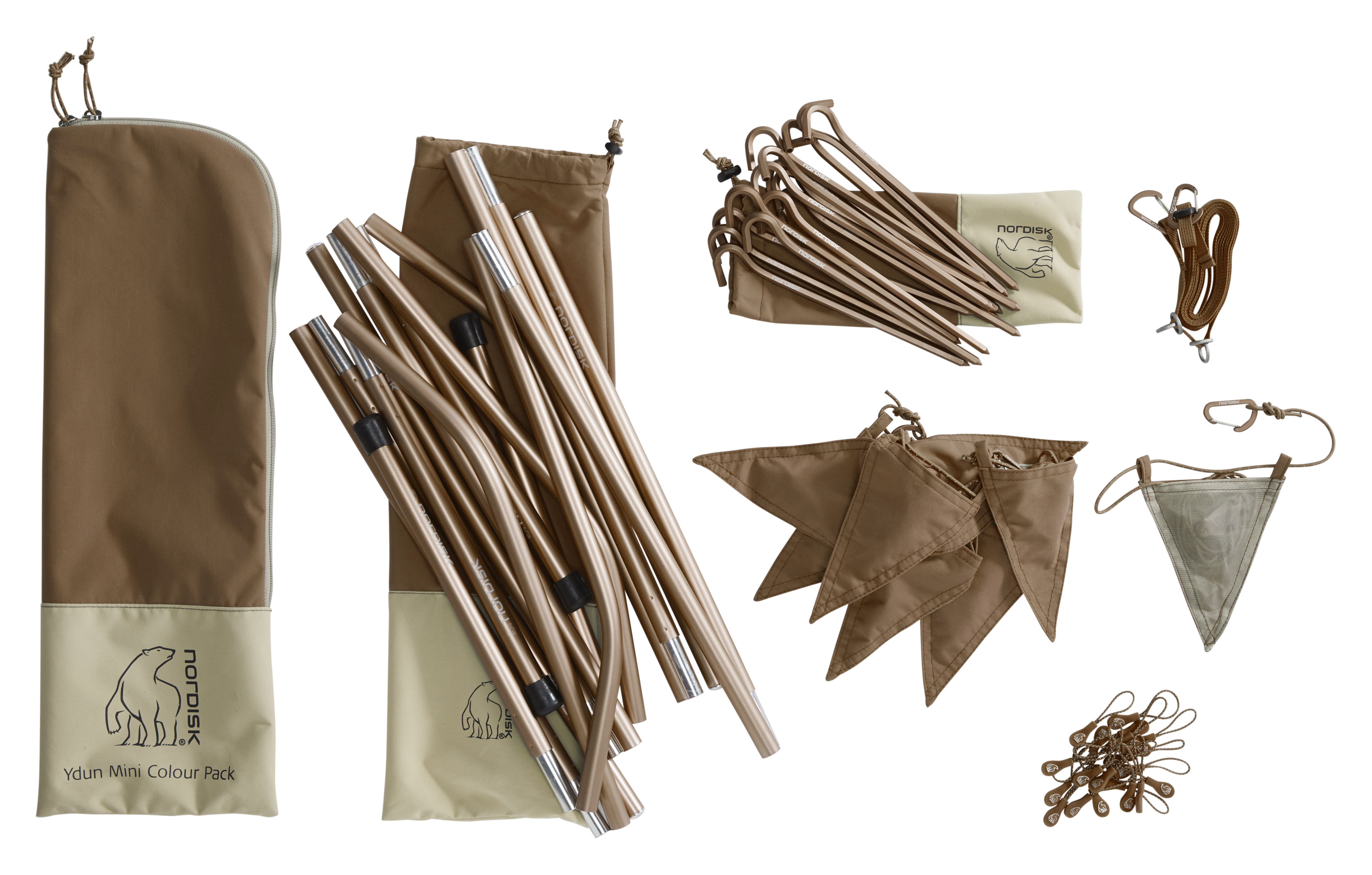 The Ydun Tech Mini Colour Packs contain all you need not only to set up your Ydun Tech Mini tent but to also make it own. Each colour pack holds all poles, pegs and guy ropes, all in the same “Colour my Adventure” colours. Also included are cool coloured zipper pullers and one clothesline for hanging small gear and clothes inside or outside the tent. The poles, 4 pre-shaped corner poles forming two A-frames when inserted into their Turtle HubTM, are made from lightweight aircraft-grade aluminium, as are the sturdy skewer pegs. Poles and pegs come with small individual bags, so they can be packed separately. Each of the guy ropes is equipped with a triangular slider for easy adjustment, a Mini Hook for easy attachment to the tent and a mesh pocket triangle, which doubles as guy rope holder and guy rope warning flag for more safety, when the guy ropes are pegged out.